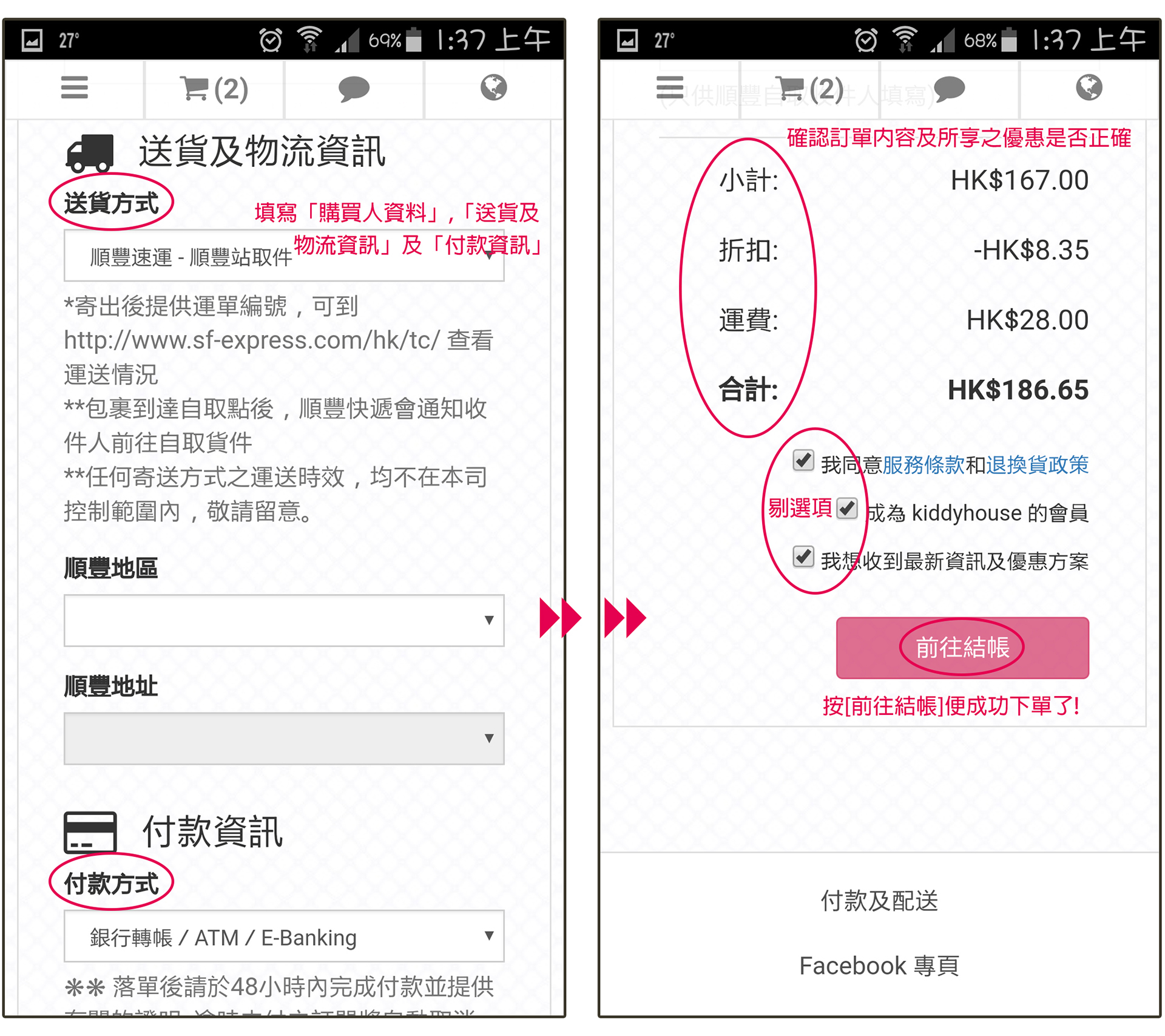 「購買人資料」、「送貨及物流資訊」及「付款資訊」, 剔選「我同意服務條款」和「退換貨政策」, 按【前往結帳】即成功完成下單