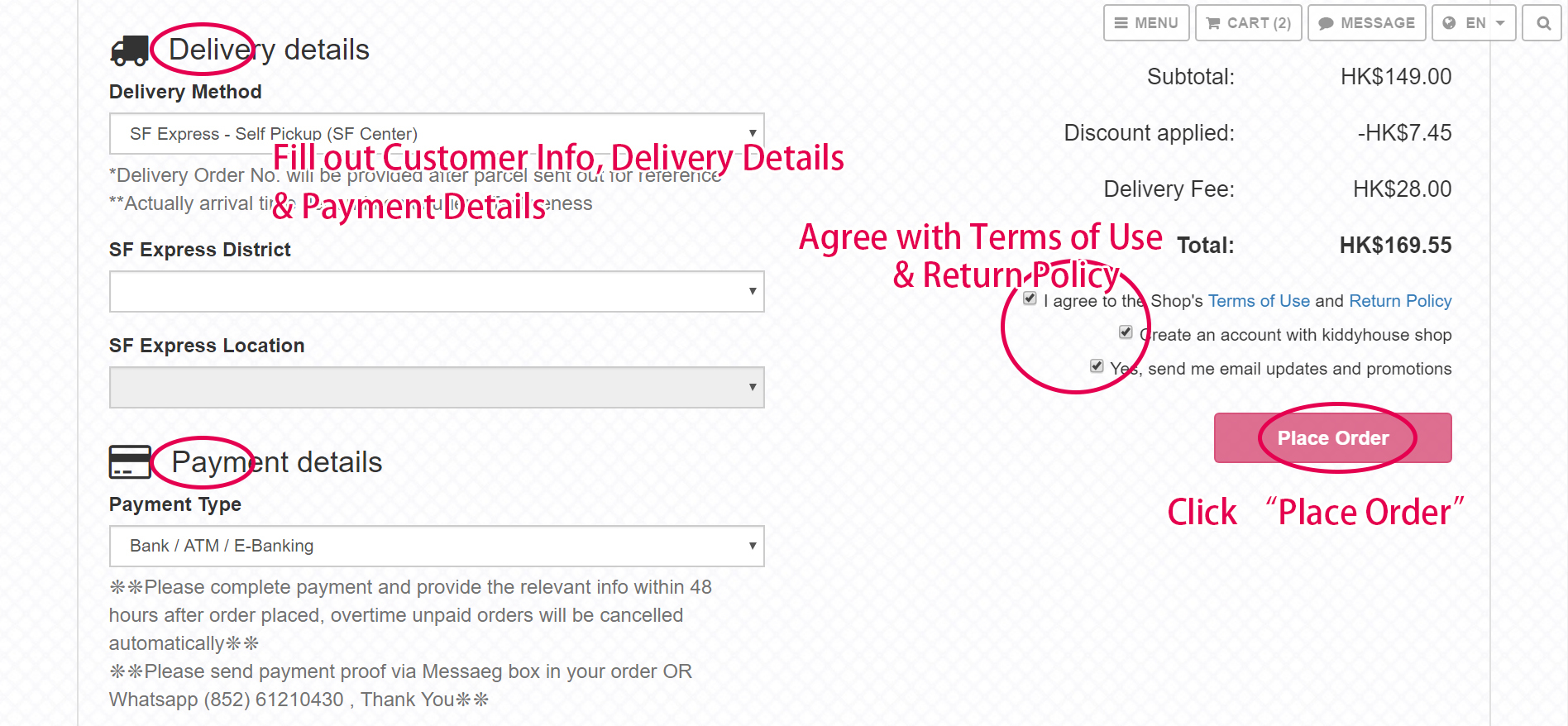 「Customer Info」、「Delivery Details」and「Payment Details」. Agree with 「Terms of Use」and「Return Policy」. Click【Place Order】to place your order.